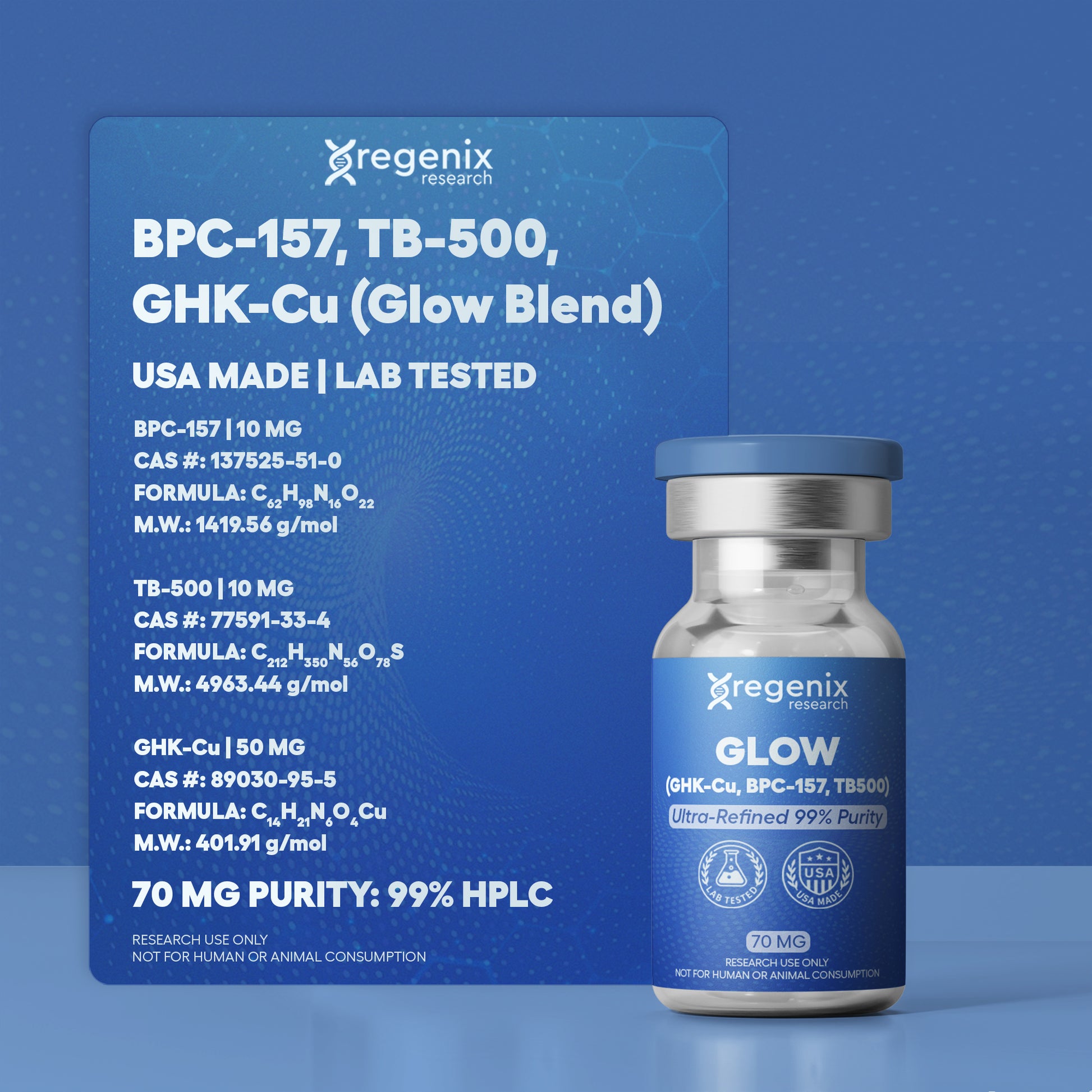Store the Glow Blend in its original, sealed vial in a cool, dry environment protected from light and moisture. For optimal long-term stability, the lyophilized peptides should be stored refrigerated or frozen in accordance with standard laboratory storage practices.